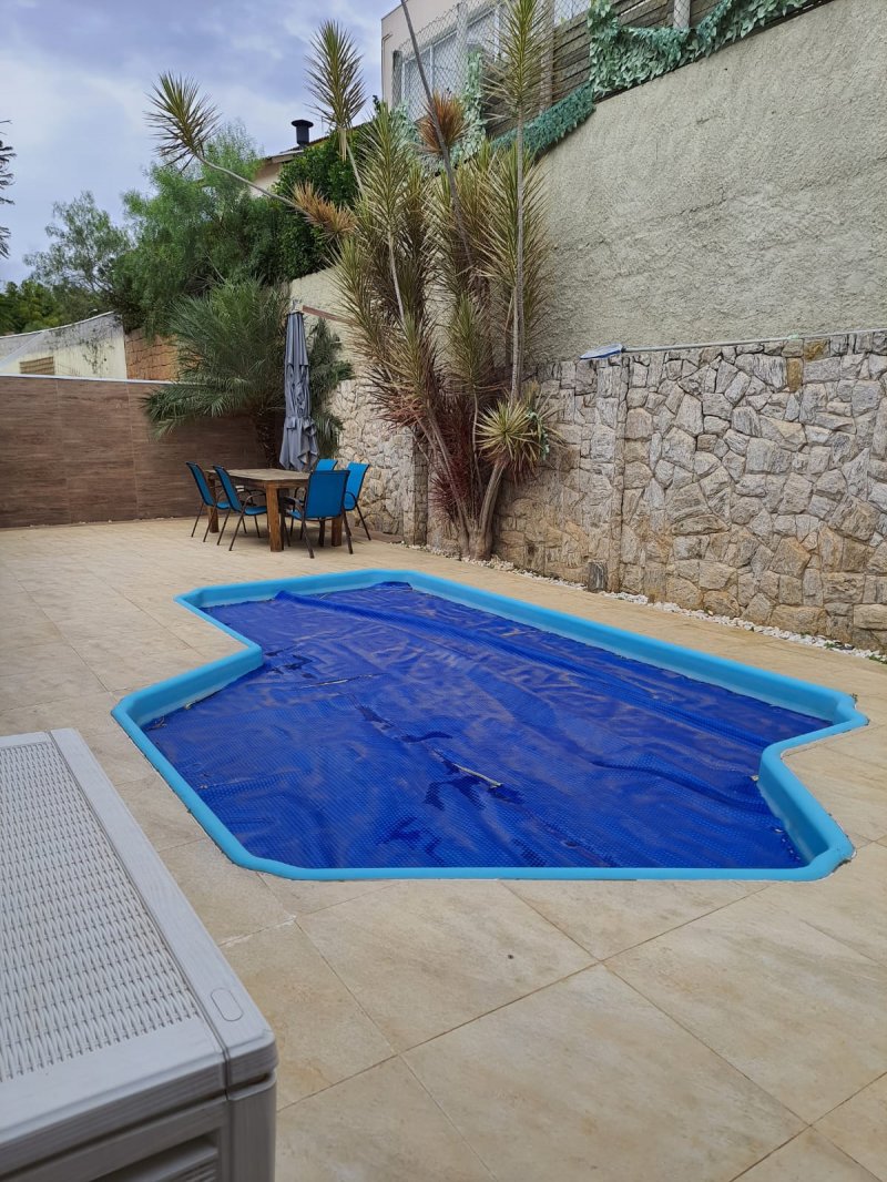 Espaço gourmet completo com ombrelone e toldo, piscina aquecida,