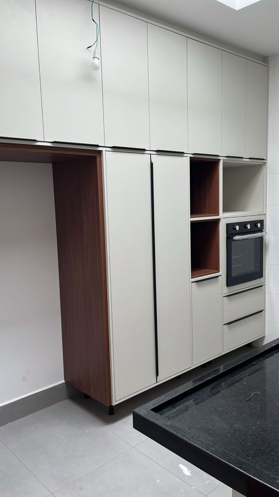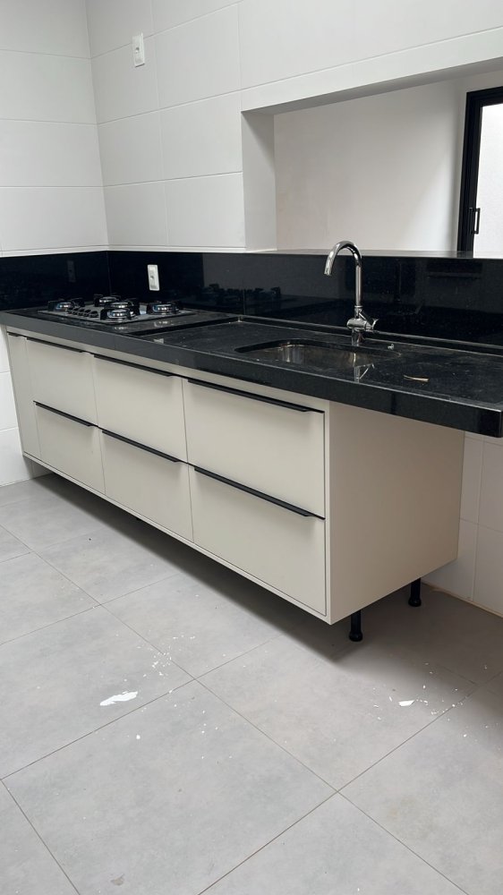 Acabamento em porcelanato e piso laminado, bancadas em pedra, janelas persianas e portas em aluminio preto. Espaço para jardim.